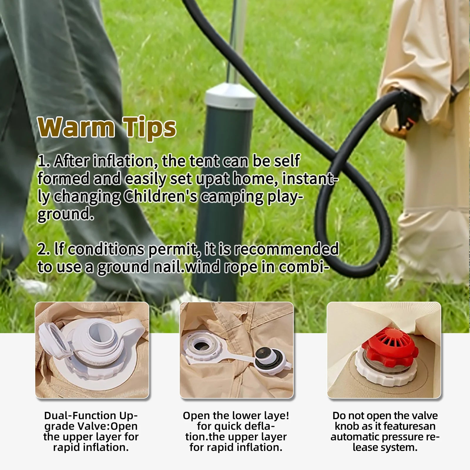 Equipped with a sleek diamond sun shelter design, this tent not only provides shelter but also enhances your camping aesthetics. Whether you're camping at a festival, spending a weekend in the woods, or enjoying a beach getaway, this inflatable tent is your ideal partner.